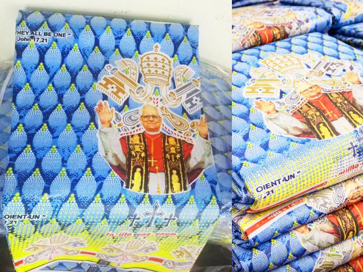 Que ce soit pour la grande messe papale, les rassemblements diocésains ou les événements paroissiaux, le pagne s’impose comme la tenue de rigueur. Il est destiné à habiller les chorales, les associations chrétiennes et les familles.