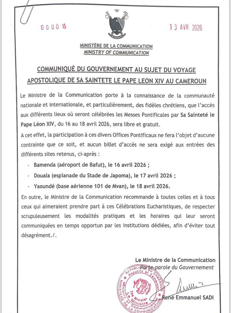 À travers un communiqué du Ministère de la Communication daté du 13 avril 2026, le gouvernement camerounais a scellé les modalités pratiques du voyage apostolique de Sa Sainteté le Pape Léon XIV au Cameroun.